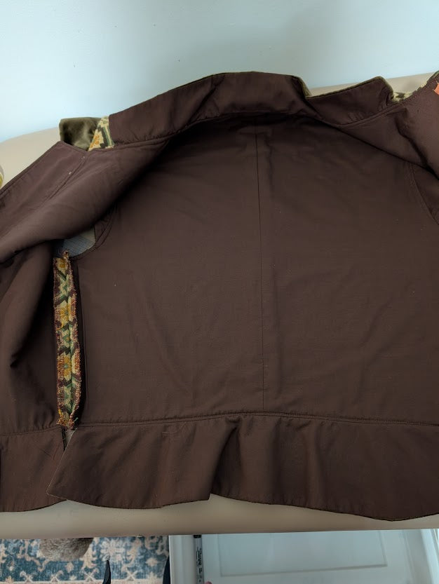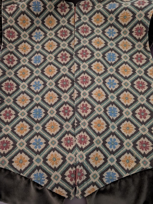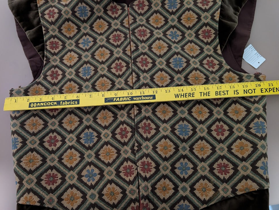 Handmade by Costumes Etc for Theatre. It has been worn twice and is in excellent. It does have our heatset label in side. It is made of brocade with poly/cotton lining. It fits someone approx 40" Chest and waist approx 34" waist. Hook and eye closure. Dry clean only
