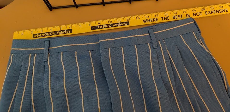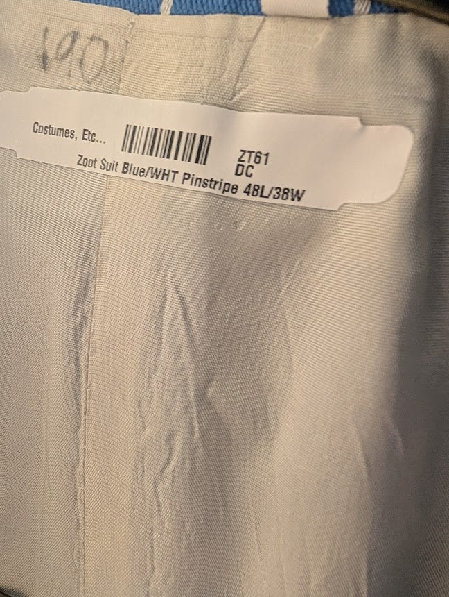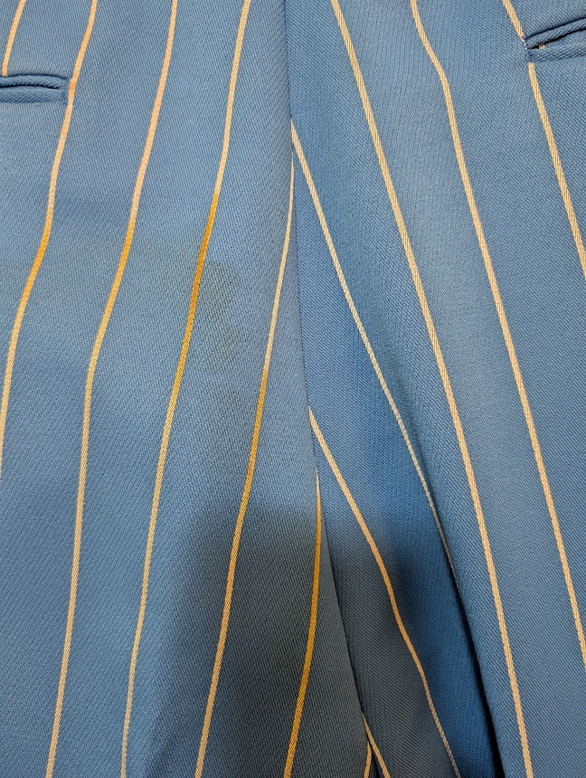 Jacket 48L, trousers 37"waist. Worn, Coat is in good shape, Pants have marks where previously hemmed (40.5 outseam where previous hem was). There are faint stains on rear of pants.