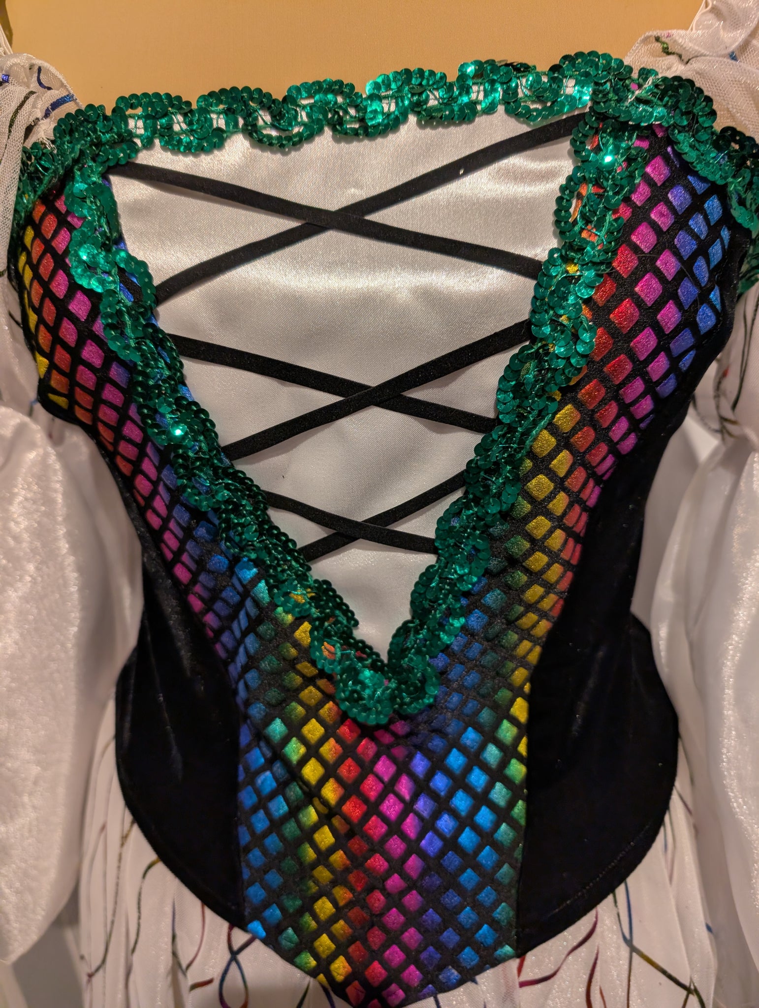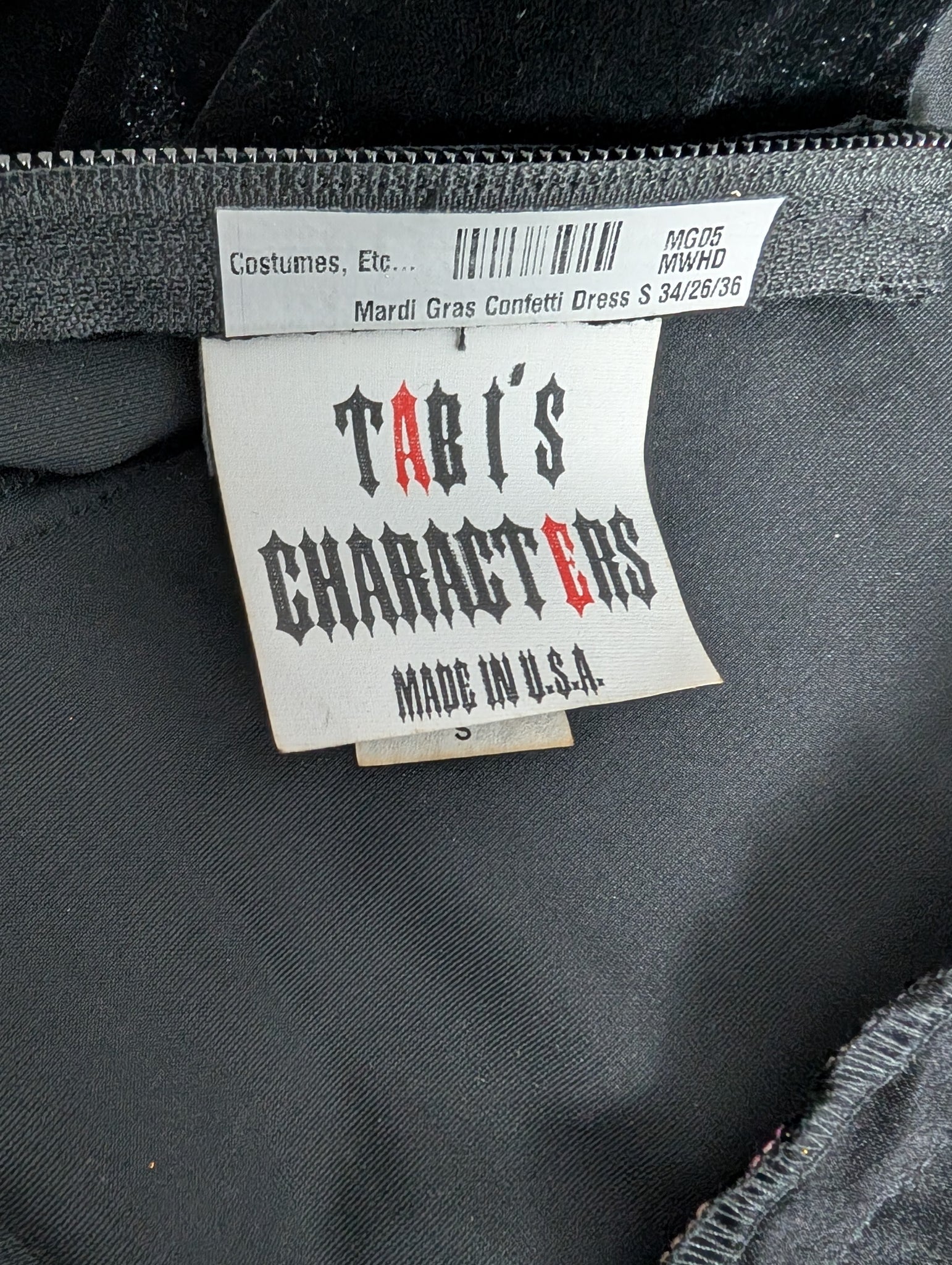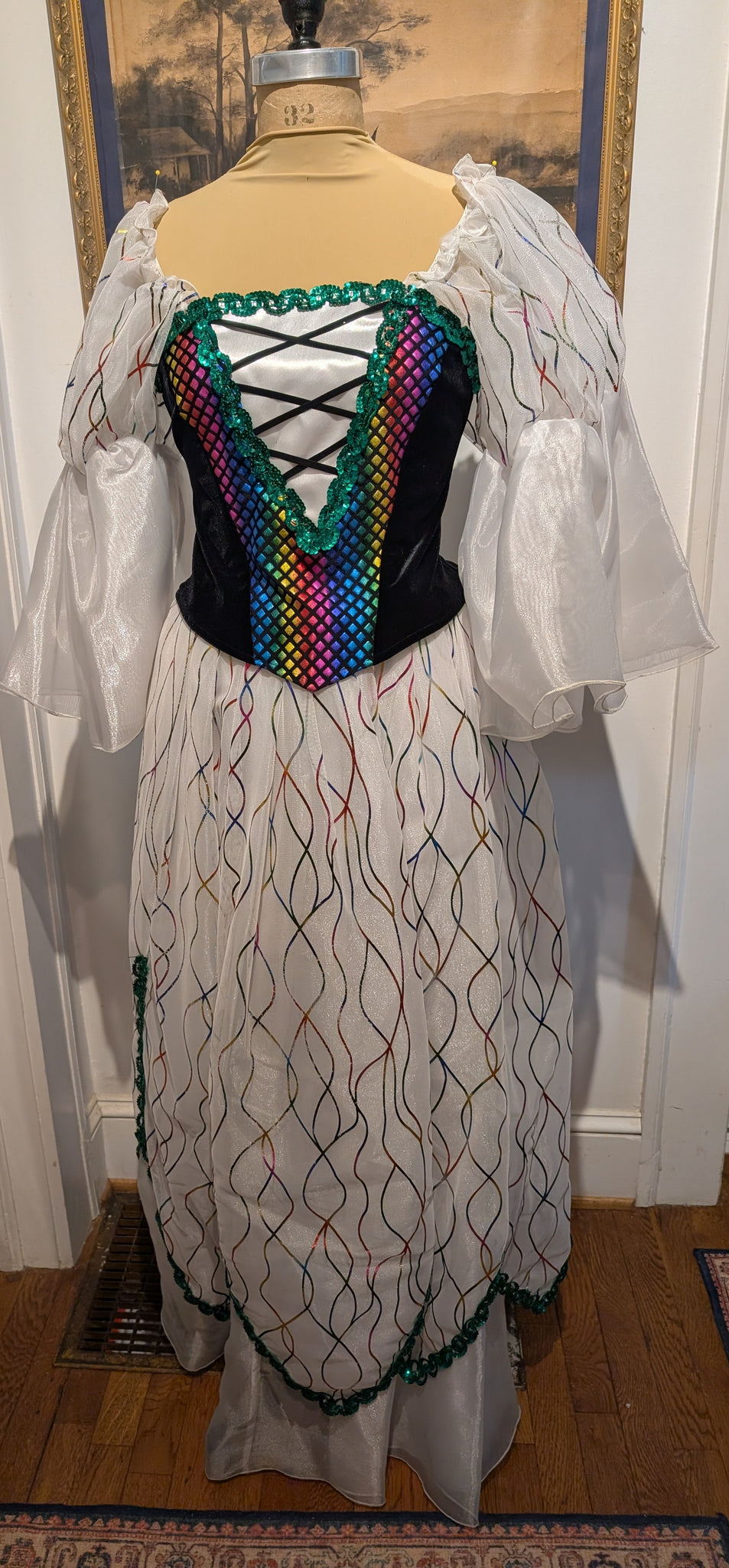 2 pc Mardi Gras Ball Gown. Costume is shown on a mannequin with a 36" Bust and 26" Waist. The skirt length is Approx 45" long. The bodice is unlined and needs elastic on sleeves replaced. The side panels are stretch and could fit a slightly larger size. The skirt has a layer of tulle stitched on a layer of twinkle, with an under skirt of twinkle. Never rented, but does have a heat set lable on bodice and skirt. The skirt has no zipper and cannot fit over a larger 36" hip.