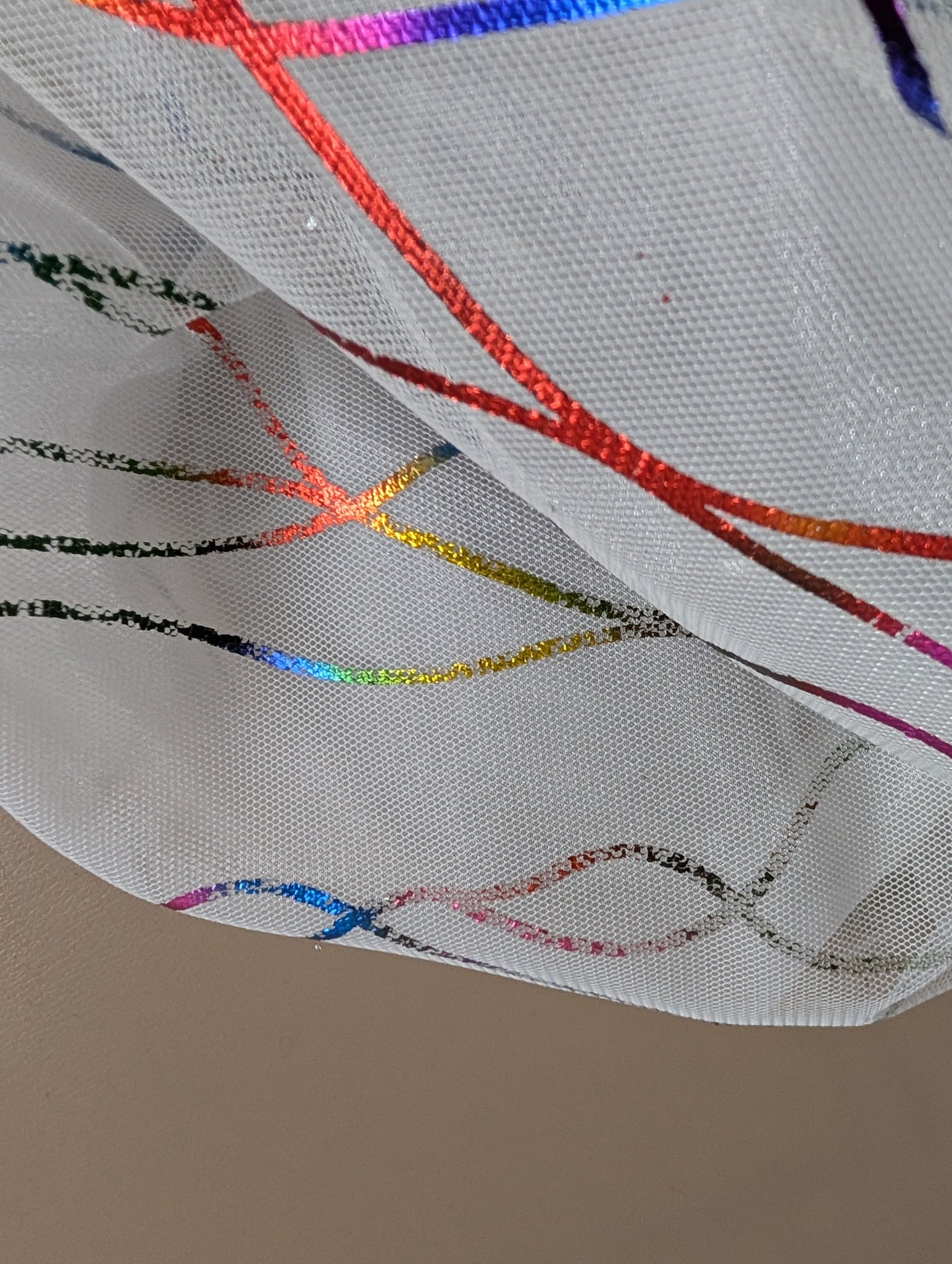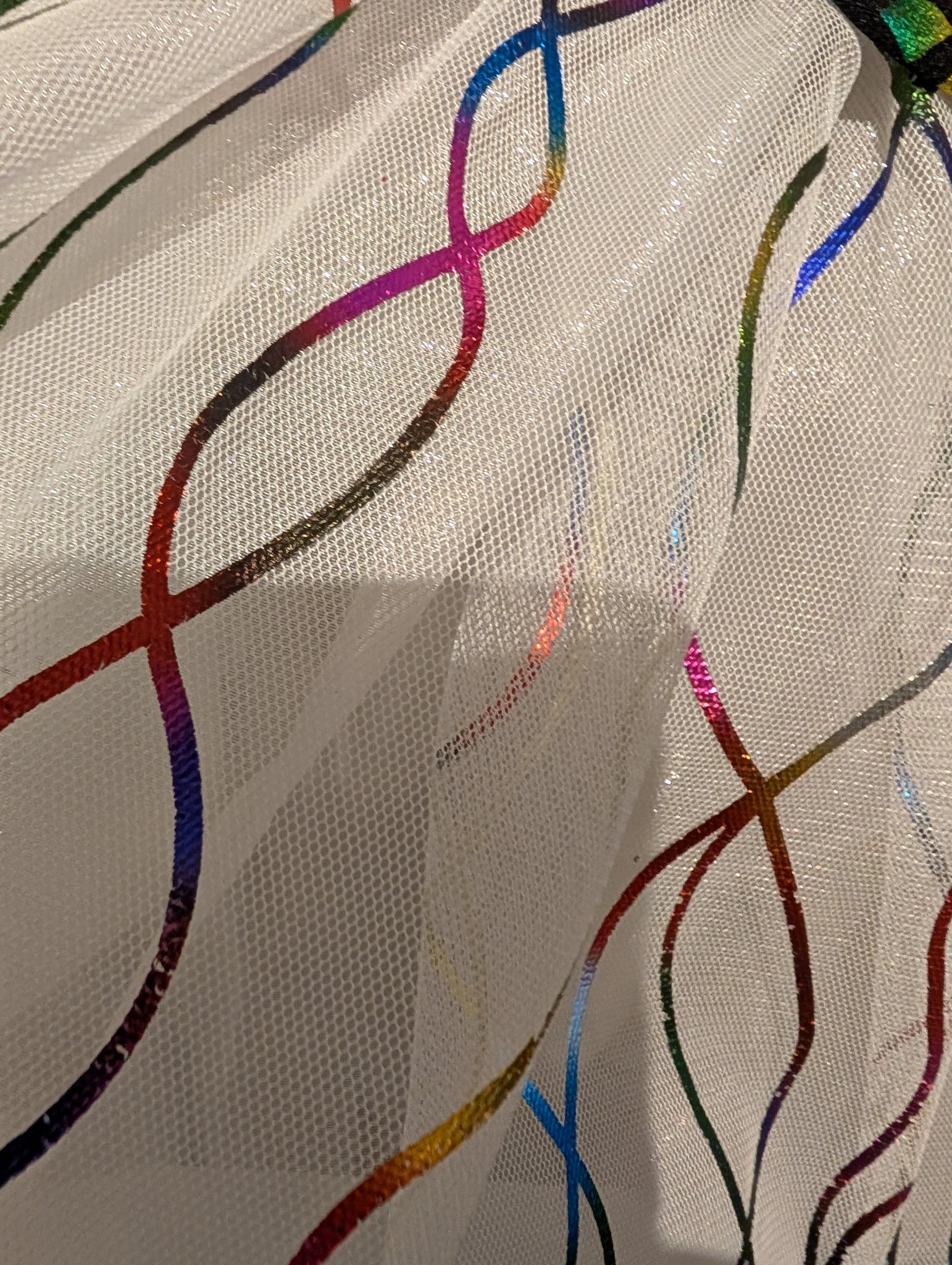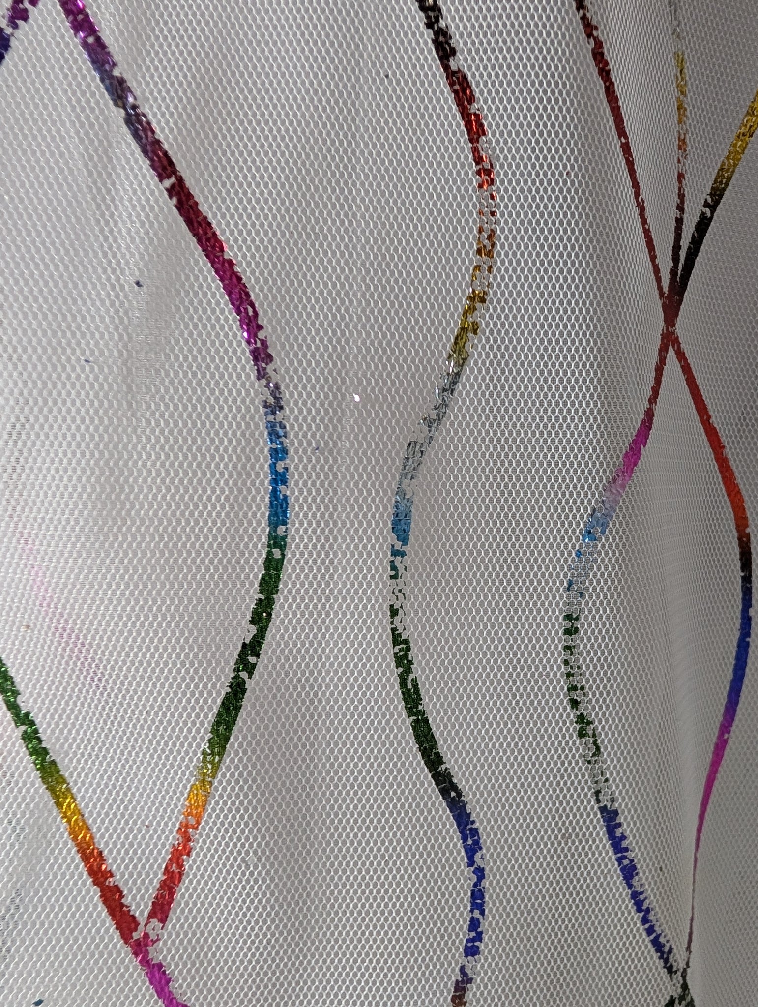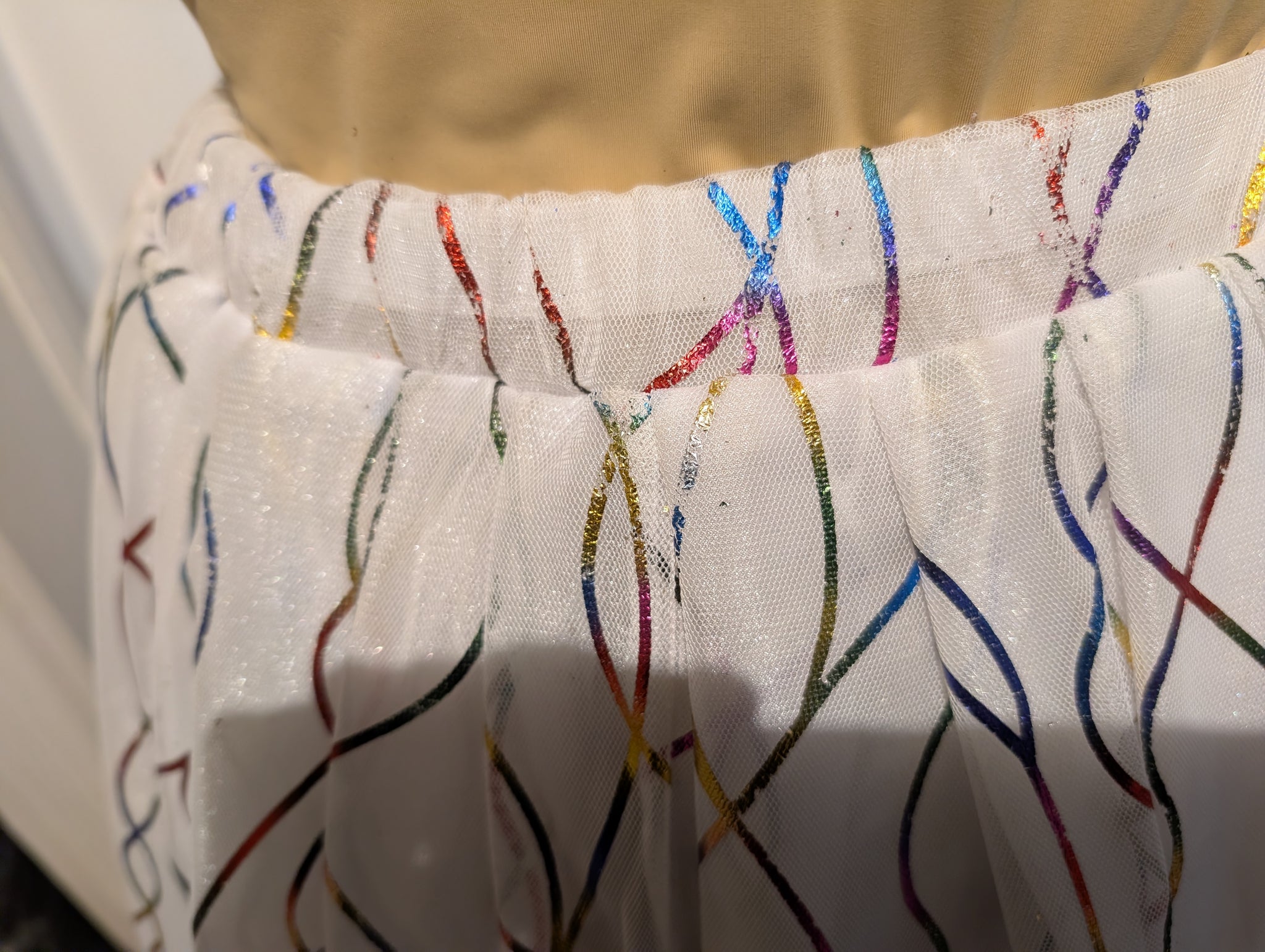 2 pc Mardi Gras Ball Gown. Costume is shown on a mannequin with a 36" Bust and 26" Waist. The skirt length is Approx 45" long. The bodice is unlined and needs elastic on sleeves replaced. The side panels are stretch and could fit a slightly larger size. The skirt has a layer of tulle stitched on a layer of twinkle, with an under skirt of twinkle. Never rented, but does have a heat set lable on bodice and skirt. The skirt has no zipper and cannot fit over a larger 36" hip.